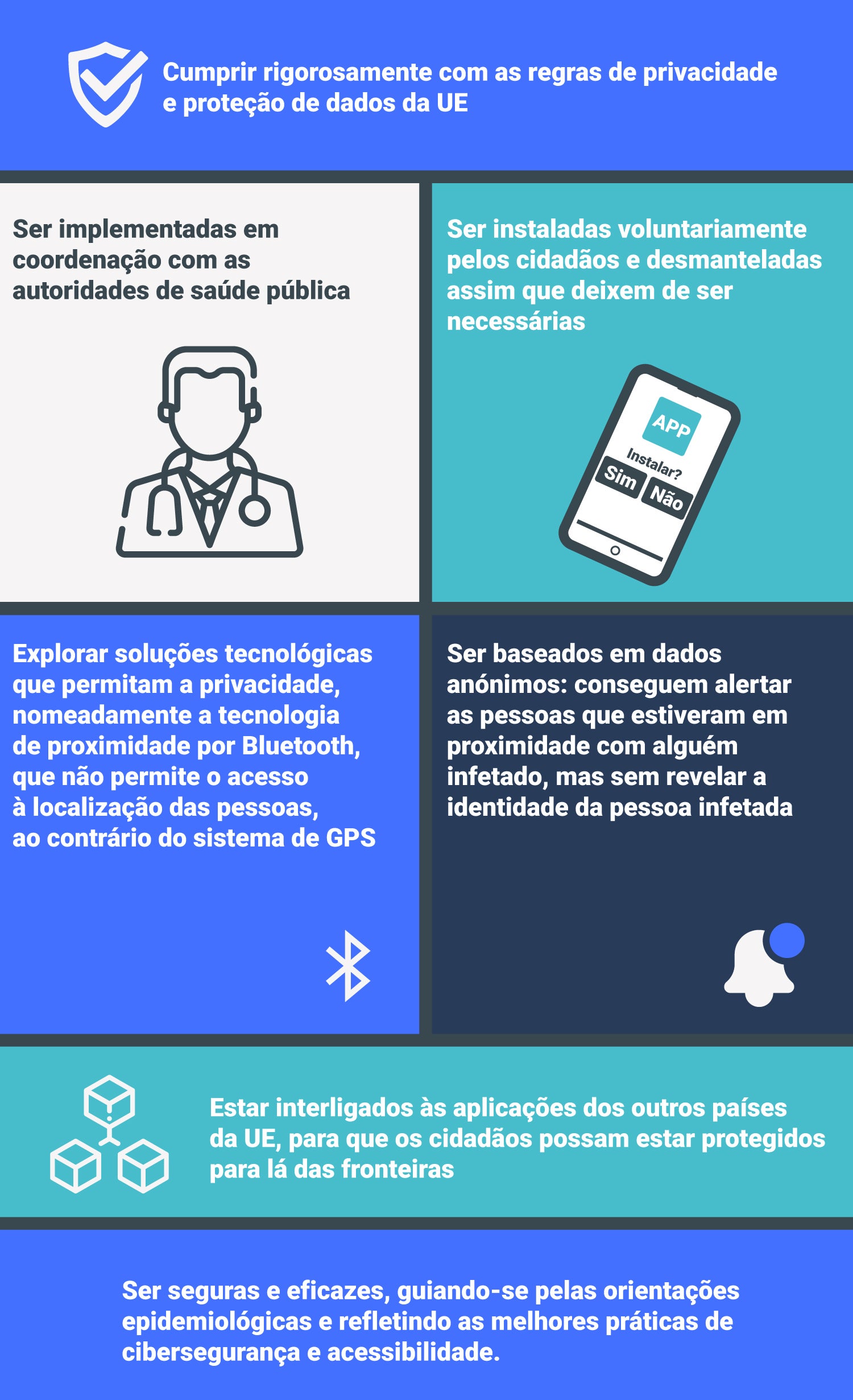 Para que todos os países europeus que se encontram atualmente a desenvolver este tipo de aplicações possam funcionar em sintonia, garantindo acima de tudo a segurança e a privacidade dos utilizadores, a Comissão Europeia lançou um guia com as diretrizes a serem seguidas para os Estados-membros. Todas as aplicações devem: