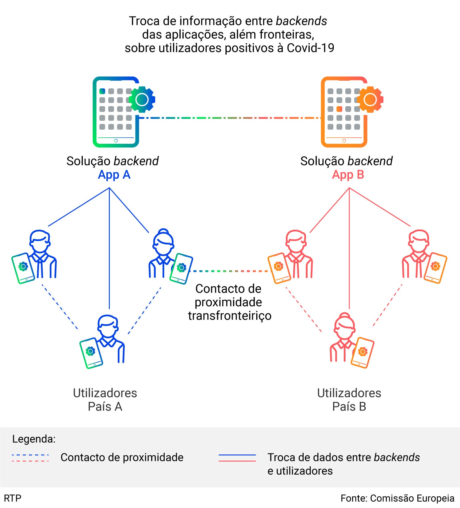 Como? O servidor (backend) controlado pelas autoridades de saúde do país da app A estará ligado ao servidor da app B. Assim, um utilizador da app A que esteja em contacto com um utilizador da app B será na mesma alertado se mais tarde as autoridades de saúde concluírem que o segundo estava infetado, ou vice-versa, apesar de serem cidadãos de países diferentes.