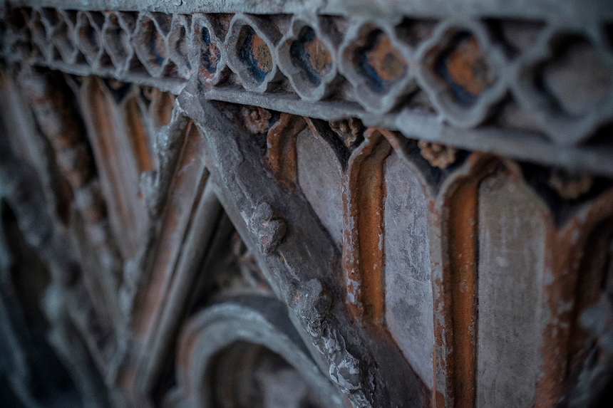 Edgar Valles, vereador da Cultura do concelho de Odivelas, e Fernanda Moroso, coordenadora do sector do Património Cultural da Câmara de Odivelas, são os nossos guias dentro do mosteiro, que nos vão contando mais sobre este túmulo à medida que circulamos continuamente à sua volta.