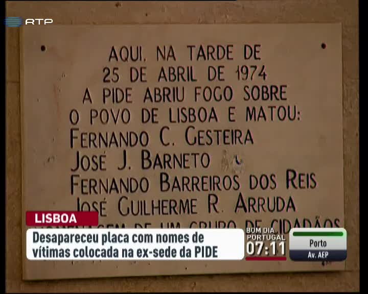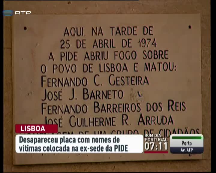 Desapareceu a placa que estava colocada na antiga sede da PIDE em Lisboa. Tinha inscritos os nomes das quatro pessoas que a Polícia Política matou no dia 25 de abril de 1974. Dizia que na tarde de 25 de abril de 1974 a PIDE abriu fogo sobre o povo de Lisboa e matou 4 pessoas. A placa era uma homenagem de um grupo de cidadãos.