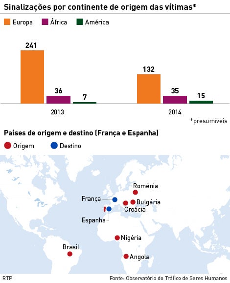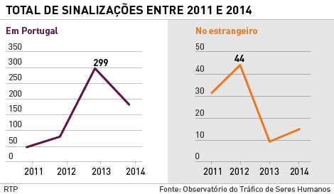 Comparativamente a 2013, em 2014 registou-se um decréscimo do número total de sinalizações (menos 36 por cento), influenciado apenas pelas situações detetadas em Portugal (menos 39 por cento), uma vez que aumentaram em 67 por cento as presumíveis situações de tráfico de seres humanos de portugueses no estrangeiro.