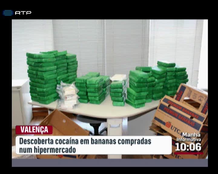 Foi encontrada cocaína em caixas de bananas num supermercado Lidl em Valença. A descoberta foi feita por um cliente. Depois do alerta, a Polícia Judiciária fez buscas em sete supermercados da mesma marca no norte do país e conseguiu descobrir 237 quilos de cocaína distribuídos por diversos sacos no fundo das caixas de bananas.