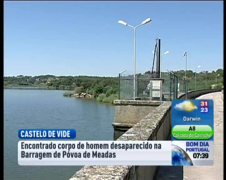 Foi encontrado o corpo do homem que estava desaparecido, desde ontem, na barragem de Póvoa de Meadas , em Castelo de Vide A roupa do homem foi encontrada junto ao paredão de descargas da barragem. A vítima que tinha entre 50 a 60 anos terá morrido afogada