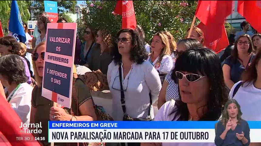 Dezenas de enfermeiros em greve manifestaram-se, esta terça-feira, no Hospital de São Bernardo, em Setúbal.