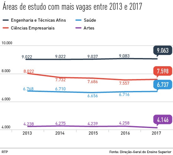 Ainda assim, dentro das áreas a dominar a oferta, Artes vai oferecer menos 112 vagas do que no ano letivo anterior, sendo a área que mais vagas perde, seguida do curso na área de Engenharia e Técnicas Afins, que perde 20 vagas.