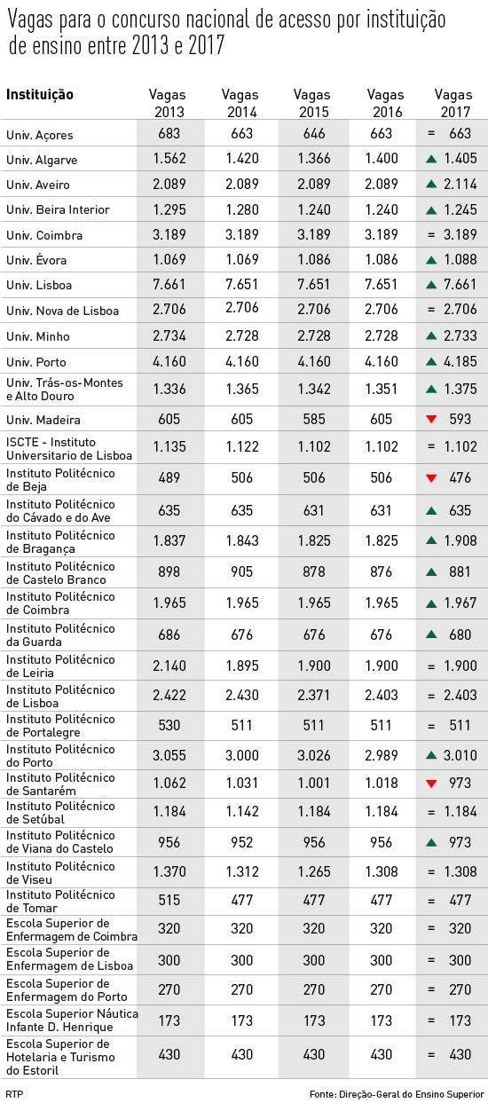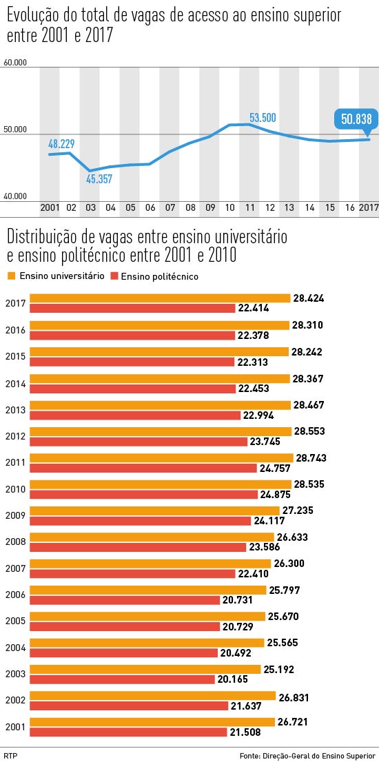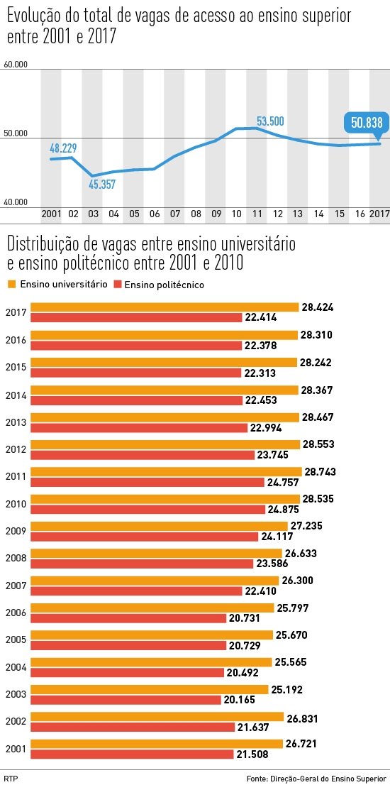 Os números deste ano revelam um aumento de vagas face a 2016. São mais 150 lugares, num total de 50.838, distribuídos por 1062 licenciaturas e mestrados integrados: 28.424 (55,9 por cento) no ensino universitário e 22.414 (44,1 por cento) no ensino politécnico.