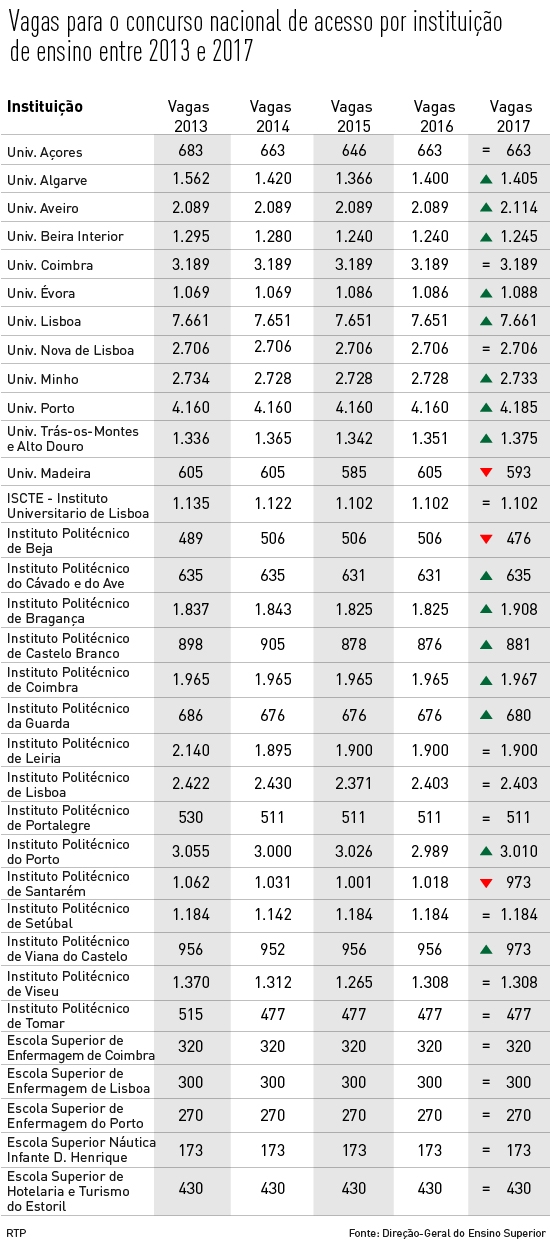 Por instituição, a Universidade de Lisboa é a que pode receber mais alunos novos (7.601). Segue-se a Universidade do Porto, com mais de 4.045 e Coimbra, com 3.189. Os números de vagas disponibilizados são idênticos aos dos últimos anos.