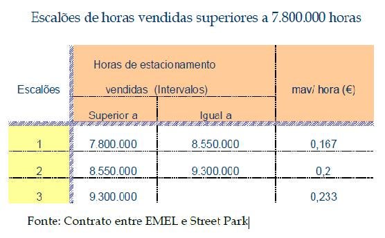- O número mínimo de horas de estacionamento vendidas asseguradas pela STREET PARK no Eixo Central, em cada período de 12 meses, não será inferior a 7.200.000. No caso de ser inferior, e salvo quando tal situação for imputável à EMEL e/ou a outra entidade pública, a STREET PARK pagará à EMEL, por escalões, os montantes constantes do quadro seguinte:
