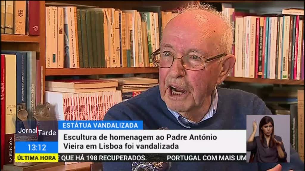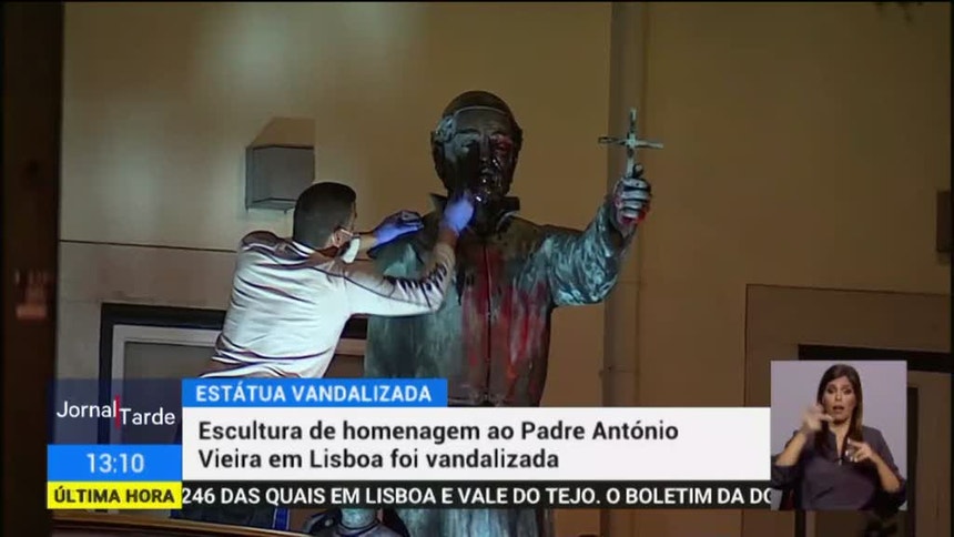 Lágrimas vermelhas no rosto, corações nas crianças que compõe a obra e na base foi pintada a palavra "descoloniza". A Câmara de Lisboa já limpou a estátua.