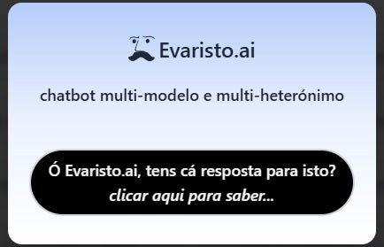 - o funcionário público - um chatbot de modelo especializado em serviços públicos portugueses disponíveis no portal gov.pt, lançado quatro meses após o Evaristo.ai geralista, que pode ser usado para obter respostas rápidas sobre assuntos relacionados com os serviços públicos online prestados pelo Estado Português. Já a este escusa de pedir um aumento, porque ele não dá: "exprimentamos!".