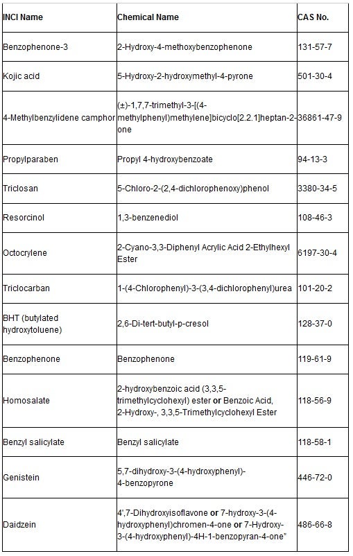 Entre a lista destas substâncias está o BHT, um composto que atua como conservante e antioxidante; o Triclosan é um antibacteriano usado em pastas de dentes, sabonetes líquidos e desodorizantes ou o Benzyl Salicylate que é usado na formulação de produtos para o banho, cabelos, maquilhagem ou perfumes.