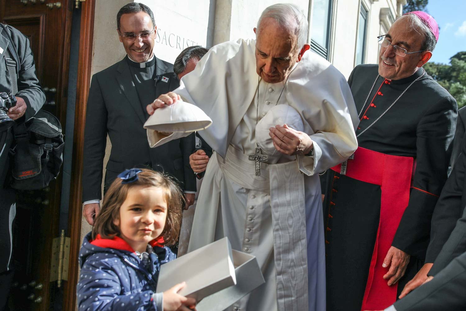 Francisco está muito bem disposto e ri e brinca com os fotógrafos e com quem o aguarda à entrada da Basília.