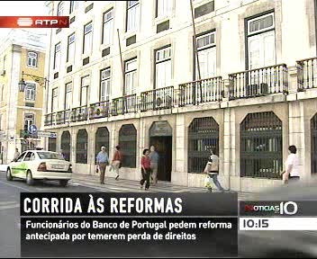 Estão a aumentar os pedidos de reforma entre os quadros do Banco de Portugal. Cortes salariais e aumento da idade de reforma estão na base dos pedidos. Actualmente podem reformar-se com 60 anos, desde que tenham trinta e cinco de serviço. Mas com as novas regras a entrar em vigor em Janeiro a idade passa para 65 anos. Mesmo correndo o risco de penalização, são muitos os bancários que estão a solicitar a reforma antecipada.