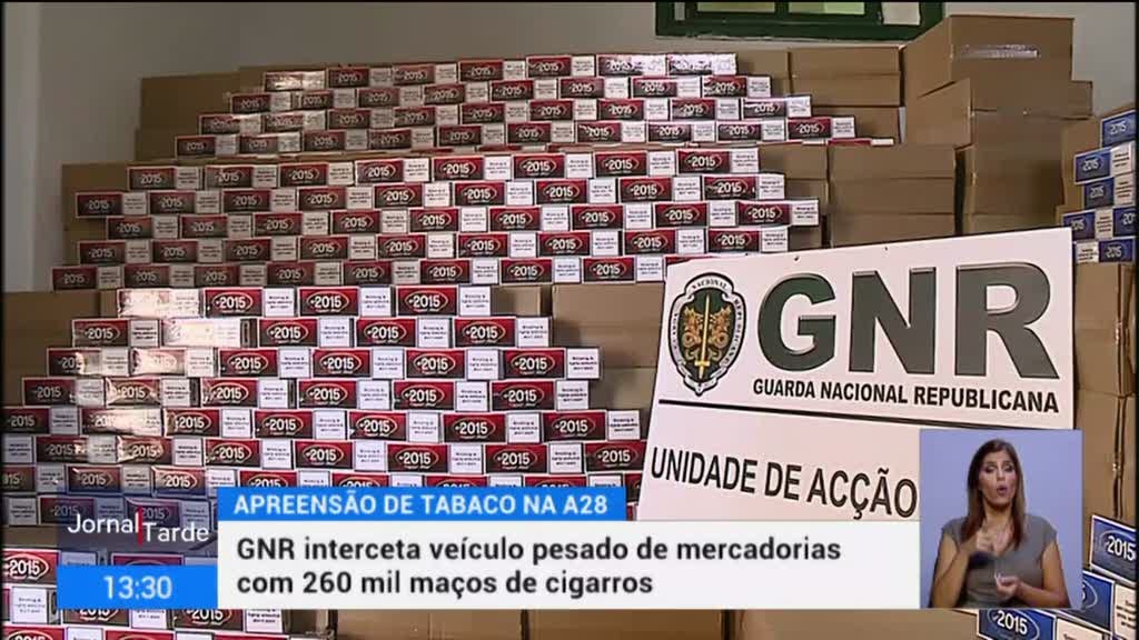 A GNR apreendeu 260 mil maços de cigarros, numa operação de fiscalização na A28. São mais de cinco milhões de cigarros. O tabaco, com valor comercial superior a um milhão de euros, era transportado por um veículo pesado de mercadorias que foi intercetado na estação de serviço de Modivas, em Vila do Conde.