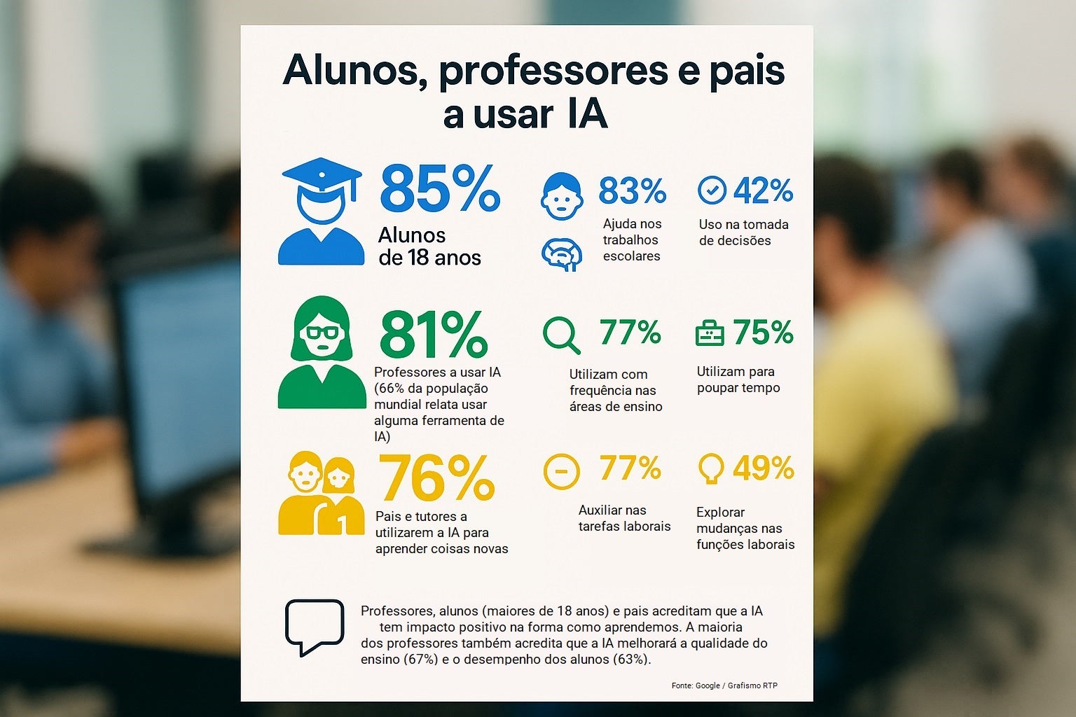 A multinacional tecnológica Google andou a analisar o comportamento digital dos cibernautas e pela primeira vez, as pessoas referem que a sua principal motivação para utilizar a IA não é o entretenimento, mas sim a aprendizagem. Os adolescentes, em particular, estão entusiasmados, e procuram cada vez mais orientação e equilíbrio neste mundo virtual, que continua a ter muitas armadilhas.