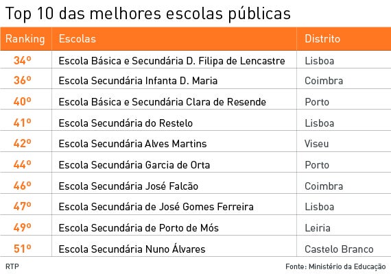 A escola pública com melhor desempenho aparece em 34.º lugar no ranking de estabelecimentos de ensino privado (particular e cooperativo) e público. É ocupado pela Escola Básica e Secundária D. Filipa de Lencastre, situada em Lisboa. A média em exame nesta escola situou-se em 12,74 valores, num universo de 539 provas.