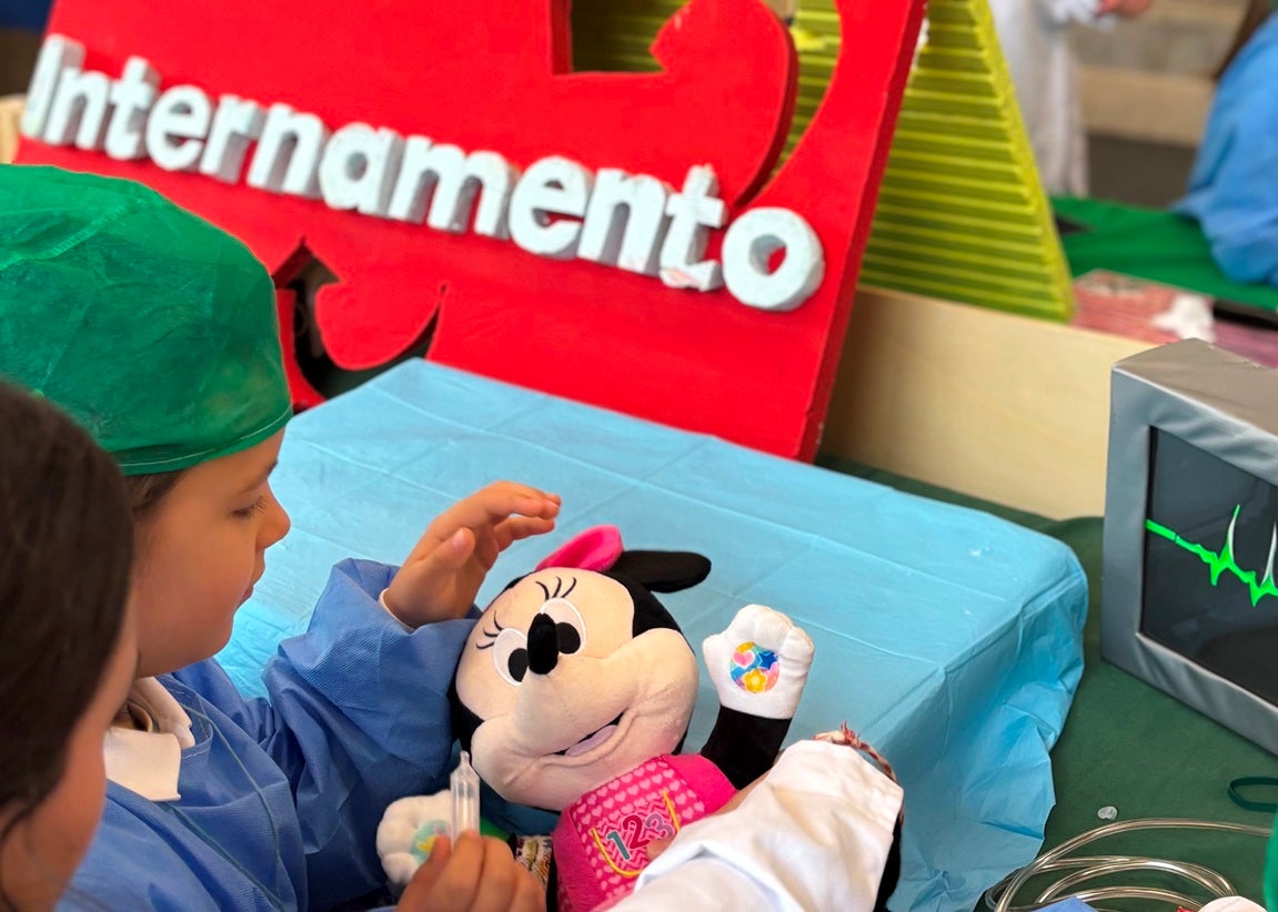 Cada criança deve trazer um peluche, que vai ser o paciente por um dia.
