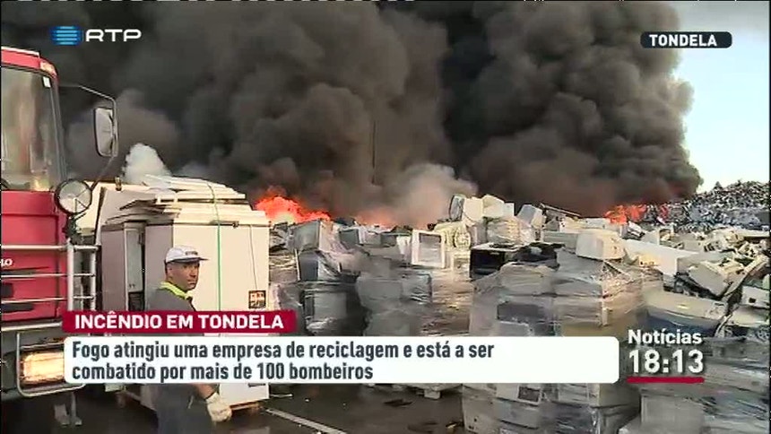 Um incêndio consome, esta quinta-feira, o plástico guardado no parque da Interecycling, uma empresa de reciclagem de equipamento e eletrónico do concelho de Tondela.