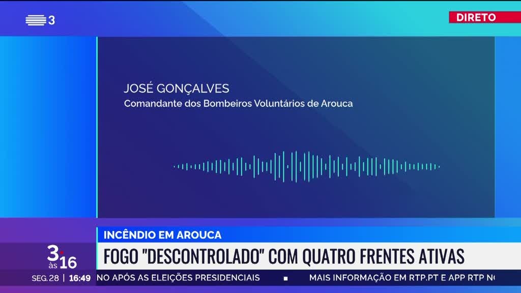 O Comandante dos Bombeiros Voluntários de Arouca falou com a RTP sobre o ponto de situação do incêndio que começou por deflagrar em Alvarenga e que mantém quatro frentes ativas que ardem com "intensidade".