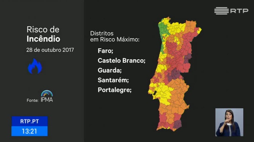 O alerta laranja de risco de incêndio foi prolongado até às oito da noite de segunda-feira. Treze concelhos do país estão este sábado em risco máximo de incêndio.