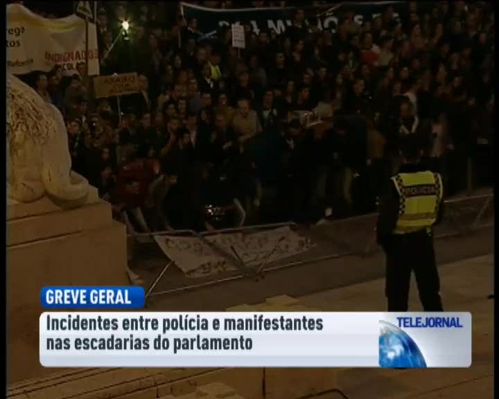 Manifestantes derrubaram as barreiras erguidas pela polícia e tentaram subir as escadarias da Assembleia da República. Os incidentes culminaram com a detenção de sete manifestantes que se concentraram no local para assinalar a Greve Geral. Há ainda um polícia ferido. A jornalista Rita Marrafa de Carvalho estava em direto na RTP Informação quando as barreiras foram derrubadas.