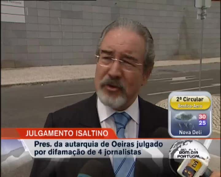 Isaltino Morais começa hoje a ser julgado.O presidente da Câmara de Oeiras está acusado de quatro crimes de difamação agravada, por declarações consideradas ofensivas CONTRA quatro jornalistas do "Sol". O presidente da Câmara de Oeiras chamou "pasquim" ao semanário e acusou os jornalistas de serem pagos pelo então líder do PSD, Marques Mendes. O julgamento tem início hoje, no Campus da Justiça, em Lisboa.