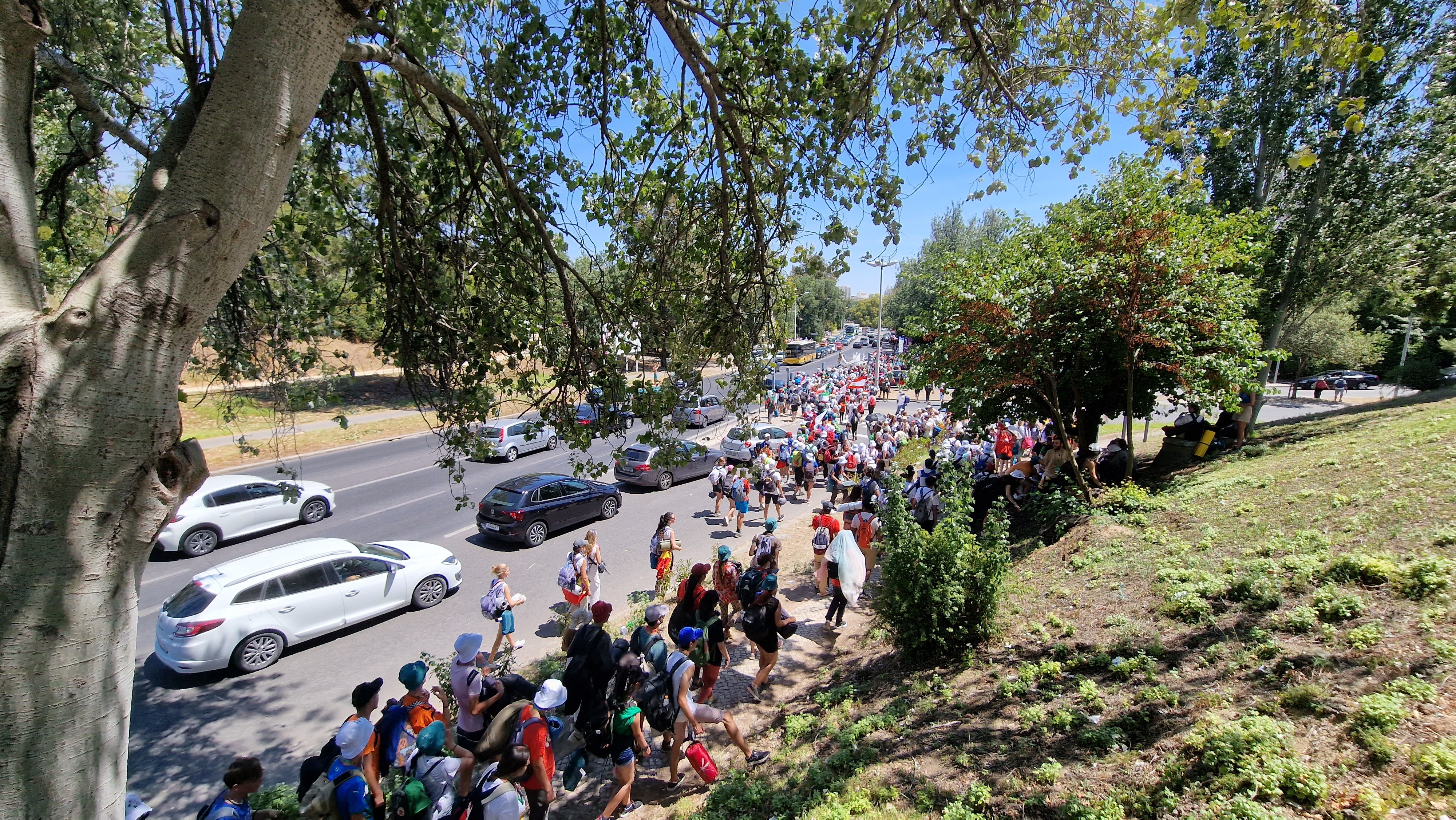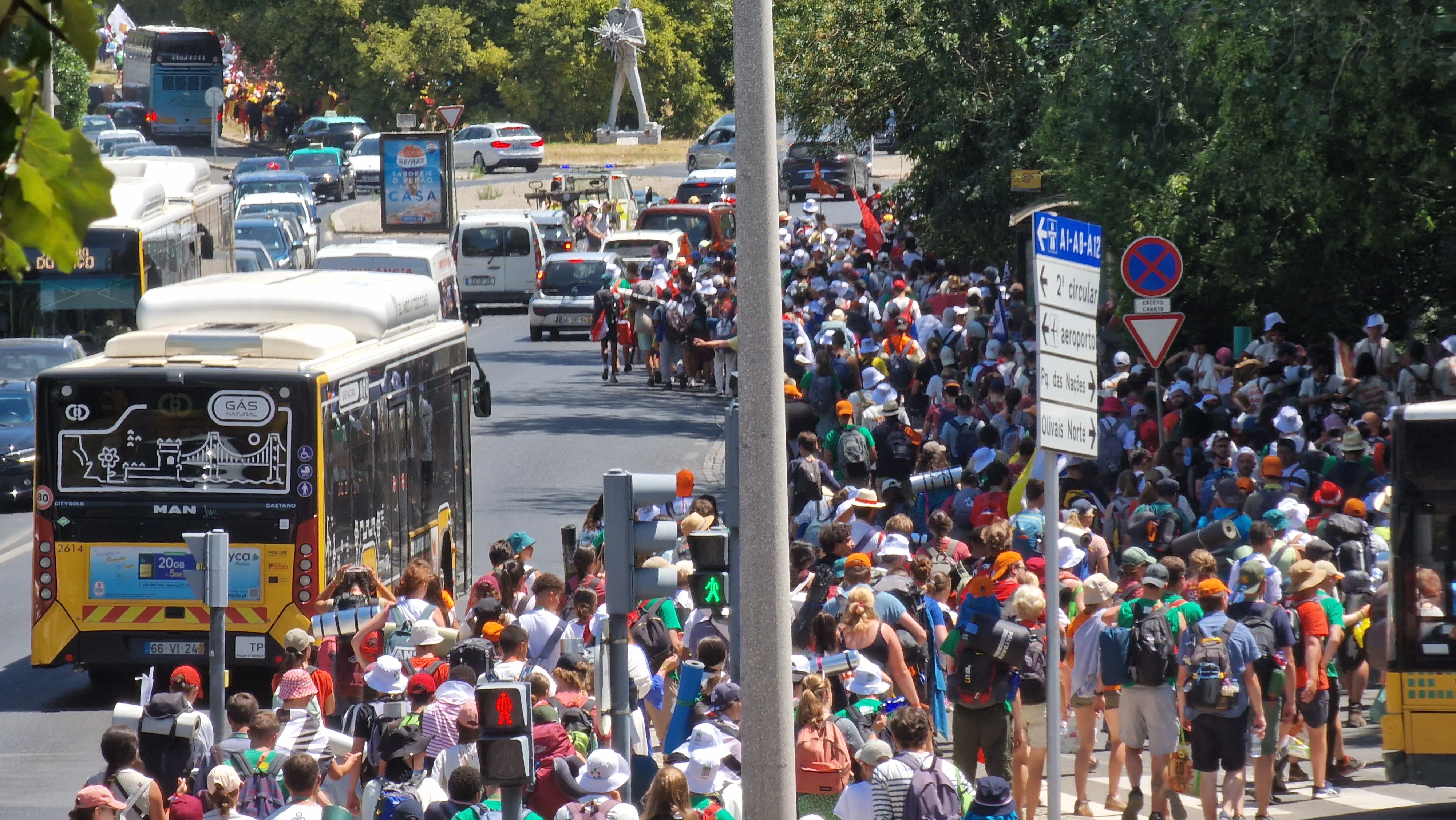 Ao longo do dia, milhares de peregrinos dirigiram-se a pé até ao Parque Tejo sob temperaturas elevadas. A grande maioria caminhou a pé por várias horas nas horas de maior calor, atravessando artérias centrais da cidade como a Segunda Circular ou o IC2.