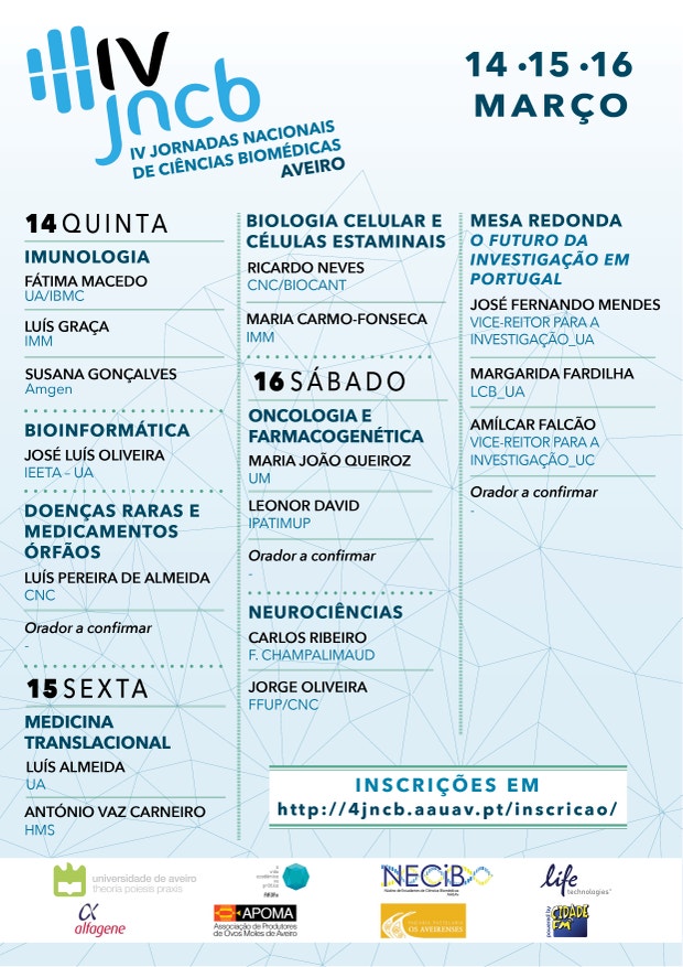 Aveiro recebe de 14 a 16 de março a organização das IV Jornadas Nacionais de Ciências Biomédicas. Com o intuito de debater a investigação biomédica em Portugal, o encontro pretende igualmente lançar novos desafios à Ciência. Toda a informação do evento pode ser vista em http://4jncb.aauav.pt/, onde também podem ser feitas as inscrições.