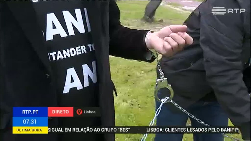 Representantes da associação de lesados pelo Banif montaram na manhã desta segunda-feira uma ação de protesto na Avenida Calouste Gulbenkian, diante do edifício do Santander Totta, em Lisboa. Parte do grupo acorrentou-se.