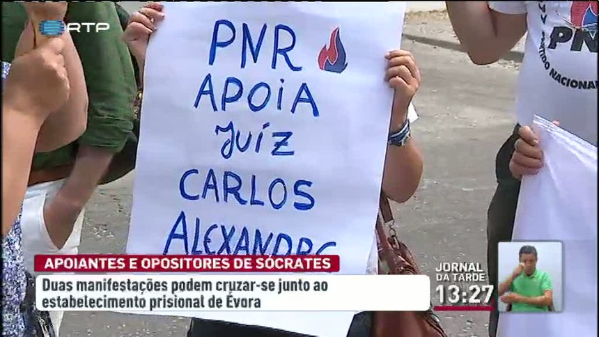 Perto de 30 apoiantes do Partido Nacional Renovador manifestaram-se este domingo junto à prisão de Évora. Os manifestantes mostram-se contra o ex-primeiro-ministro e exigem que José Sócrates não seja libertado.
