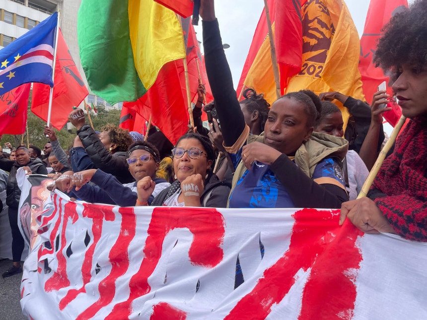 A abrir manifestação, que vai do Marquês de Pombal à Praça dos Restauradores, está uma faixa com a fotografia de Odair Moniz, segurada por familiares e vizinhos, assim como por Cláudia Simões, que acusou um agente da PSP de a agredir, numa paragem de autocarro na Amadora, em 2020.
