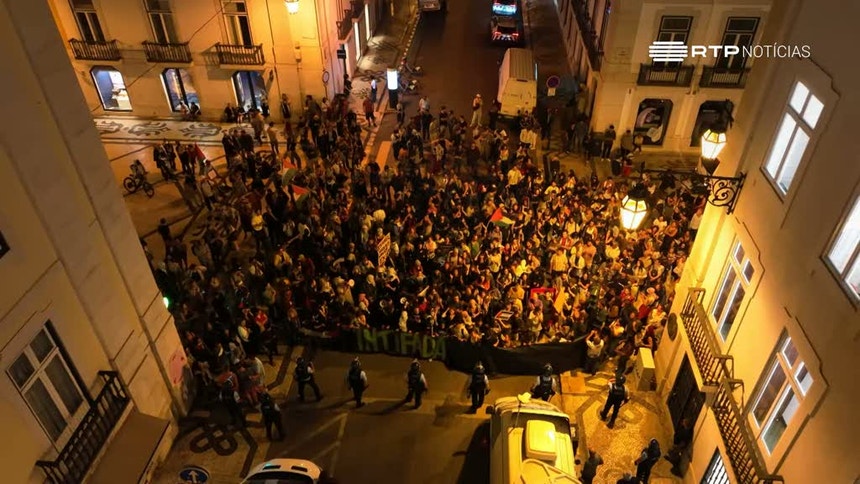 A manifestação que estava frente à embaixada de Israel, desceu até ao Marquês de Pombal. Já nesse local cerca de 100 manifestantes cortaram a Rua Augusta, cerca das 23h00, nos dois sentidos, e concentraram-se junto ao MUDE - Museu do Design, enquanto decorria o debate dos nove candidatos à Câmara Muncipal de Lisboa, transmitido pela RTP.Os manifestantes gritavam mensagens como "Palestina Livre" e palavras de ordem contra o presidente da Câmara de Lisboa, Carlos Moedas. No local estão presentes mais de dez agentes da polícia.