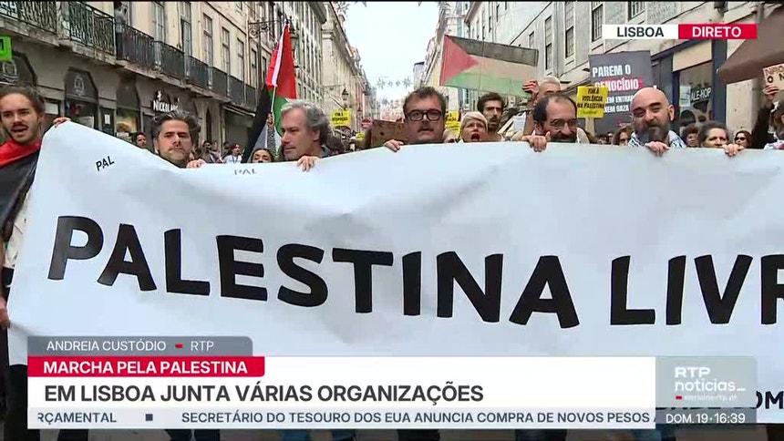 Mais de mil pessoas juntaram-se este domingo em Lisboa numa manifestação pela Palestina. Várias organizações estão presentes nesta marcha que vai terminar na Rua da Prata.