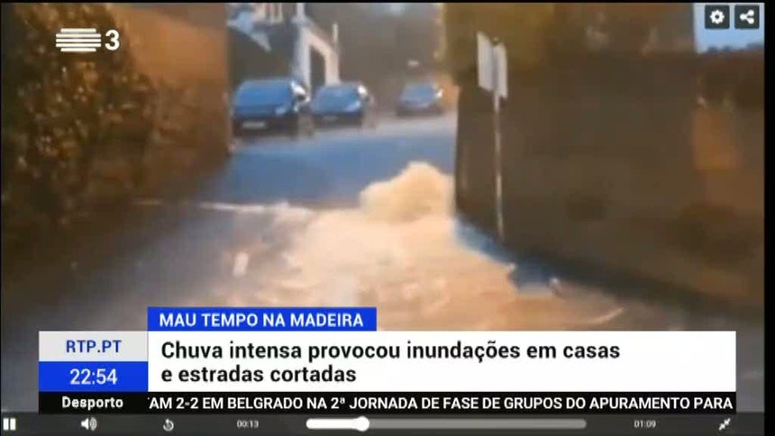 Imagens recolhidas pela RTP Madeira mostram várias zonas alagadas, estradas e mesmo garagens inundadas.