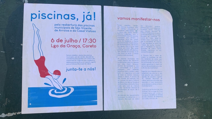 "Piscinas, já!" é o que se pede num protesto popular pela reabertura das piscinas de São Vicente, de Arroios e do Casal Vistoso.