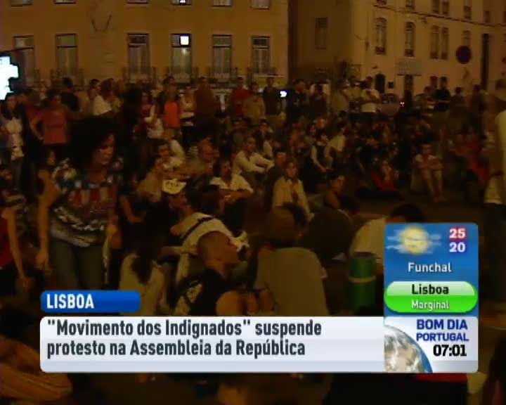 O movimento dos indignados ocupou ontem à noite a rua frente à Assembleia da República em Lisboa. A polícia viu-se obrigada a cortar o trânsito. O protesto terminou por volta das onze da noite. No sábado, durante a Assembleia Popular, foi aprovada a realização de uma greve geral contra o acordo da Troika e marcado um novo protesto para o dia em que o orçamento foi votado no Parlamento.