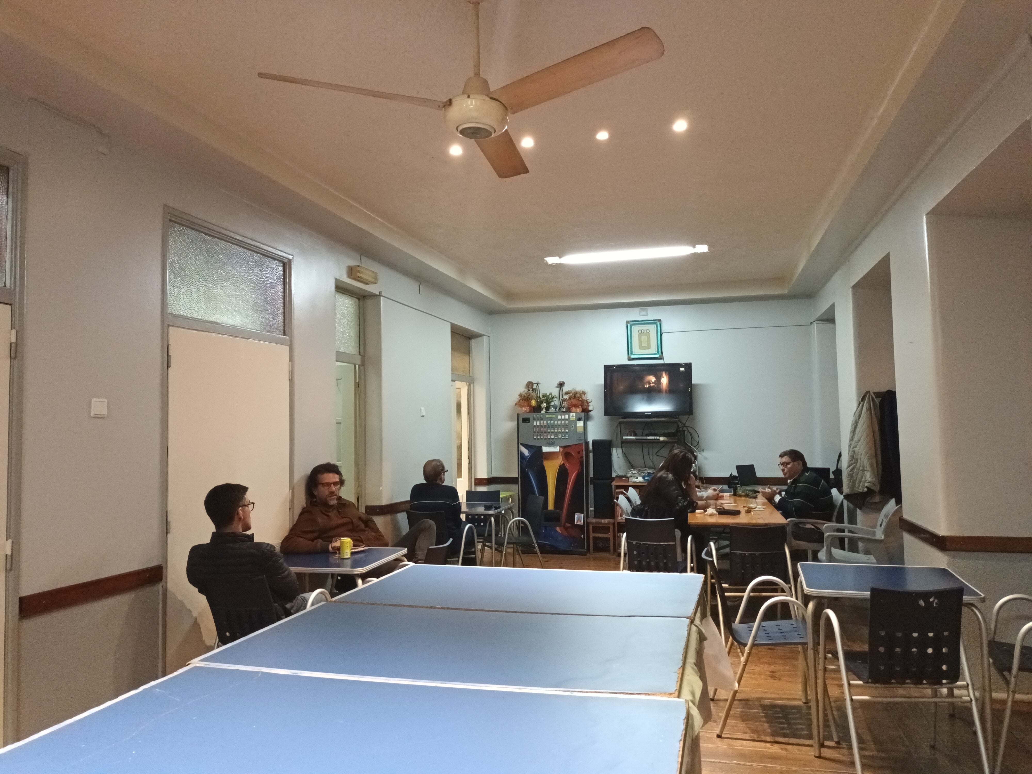 Saindo do salão, dois corredores levam até à sala de convívio da coletividade, onde se joga às cartas e fuma, com as janelas abertas. É aqui que se encontra Carlos Melo, presidente da SMOP, à conversa com outros sócios, entre os mais de 460 que apoiam a associação.