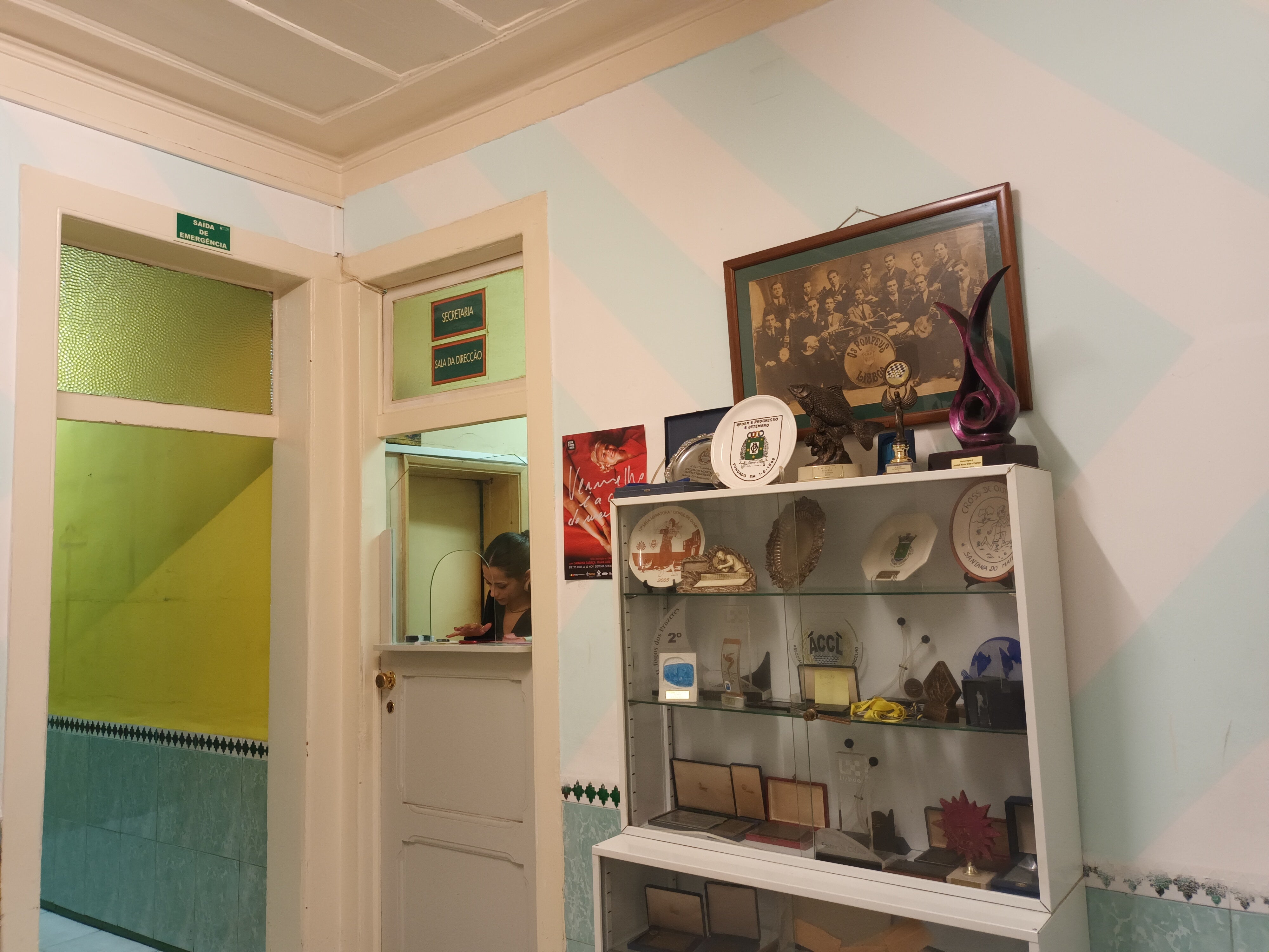 O pai de Nelson Ricardo, organizador da sessão literária, não vinha aqui há mais de 50 anos. “Já nem sabia onde é que era isto”, admite Rui Costa. Recorda a arrumação dos corredores: paredes brancas e azuis, com azulejos e algumas manchas negras, e uma vitrine de fotografias, troféus, placas e pratos. Diferenças desde a última vez? “Praticamente não houve nenhuma evolução, isto está muito antigo”, responde.