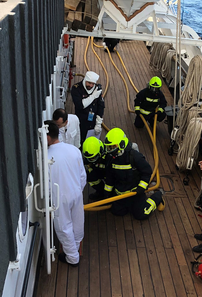 Nesse caso, uma colisão de frente, com a quilha da Sagres, não representa um perigo grave, mas uma colisão lateral poderá causar rasgões no casco do navio e, em consequência, alagamento dos compartimentos afectados. Para isso existem os exercícios de combate a situações de alagamento, também integrados no programa de exercícios que a equipa de avaliadores externos está monitorizando no navio. Hoje à tarde teve lugar o último exercício, com simulação de fogo nos geradores.