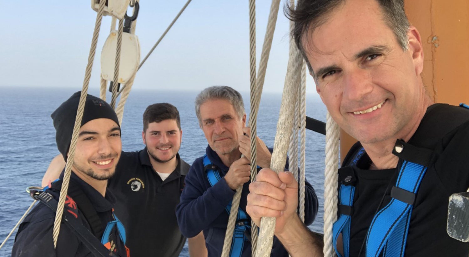 Rui Manuel Silva (dir.) e António Louçã (centro) com dois membros da tripulação do Navio-escola Sagres