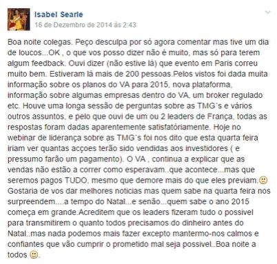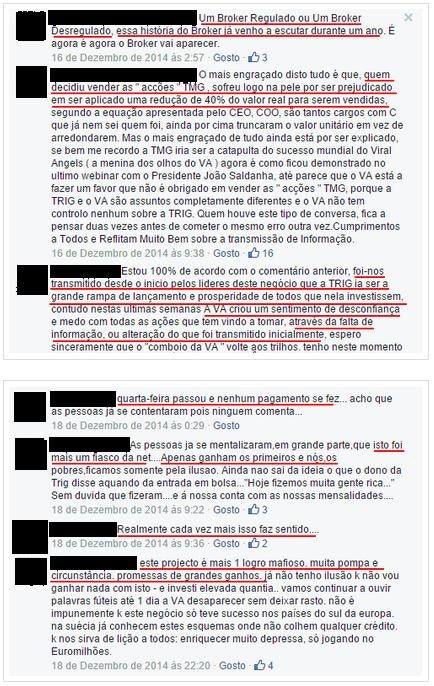 Num dos muitos grupos fechados do Facebook, usados para promover este negócio, tivemos oportunidade de ler mensagens de uma das angariadoras de investidores, a referir que em 2015 já não deveriam existir mais problemas e, logo de seguida, os comentários dos membros insatisfeitos, a denunciar o próprio golpe.