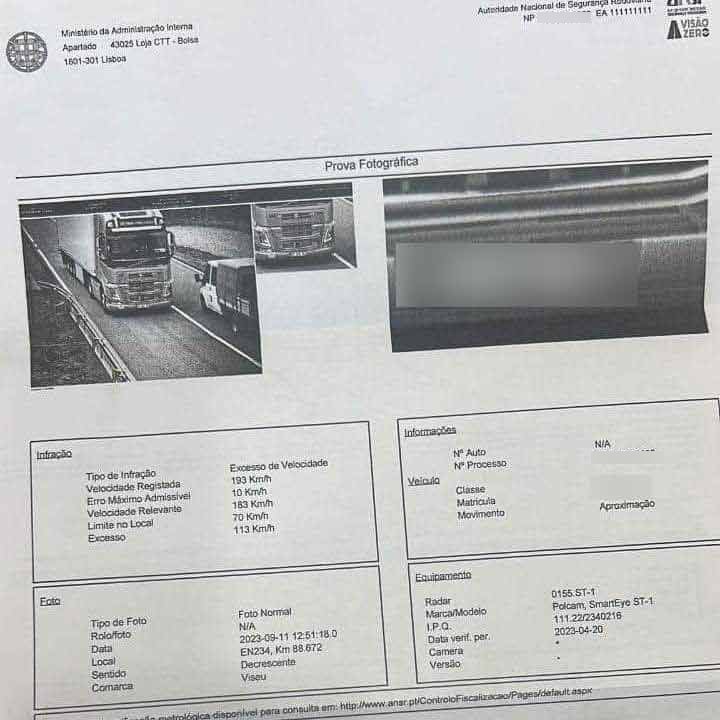 Documento enviado pela ANSR do registo efetuado por um dos radares, identificado postriormente com problemas tecnicos. Foto: Documento enviado pela ANSR - Ministério da Administração Interna.