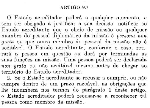 A Convenção de Viena sobre Relações Diplomáticas prevê também no artigo 9.º que o "Estado acreditador" possa, a qualquer momento, "e sem ser obrigado a justificar a sua decisão, notificar ao Estado acreditante que o chefe de missão ou qualquer membro do pessoal diplomático da missão é persona non grata".