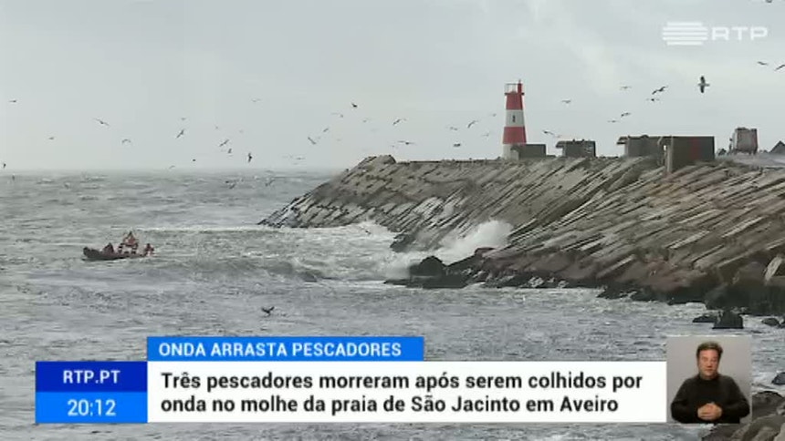País Onda arrasta três pescadores em Aveiro Três pescadores morreram quando foram arrastados por uma onda num molhe de Aveiro. RTP / VER MAIS As autoridades não proíbem mas desaconselham a circulação nestes locais em dias de forte vento e violenta agitação marítima. PUB