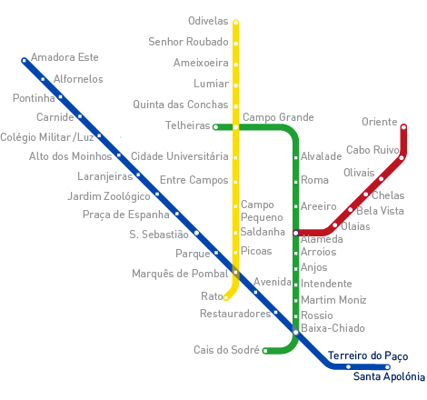 Em março de 2004 a Linha Amarela chega a Odivelas, com cinco novas estações, Quinta das Conchas, Lumiar, Ameixoeira, Senhor Roubado e Odivelas. E em maio a Linha Azul chega à Amadora, com a inauguração de duas novas estações, Alfornelos e Amadora-Este. Pela primeira vez na história o metro sai dos limites do concelho de Lisboa. Em outubro, no âmbito do prolongamento da Linha Vermelha, arrancam as obras de construção do túnel entre Alameda e São Sebastião.