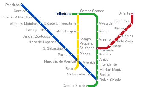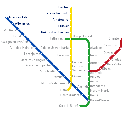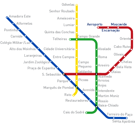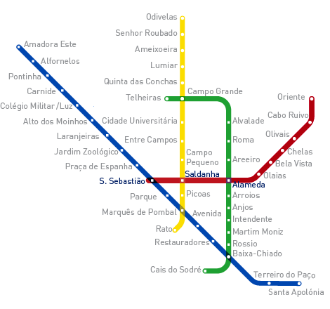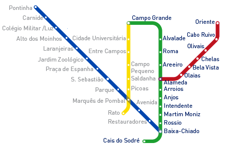 Em 1998, a cidade de Lisboa recebe a Expo 98 e o Metropolitano de Lisboa passa a ter quatro linhas, altera os nomes a algumas das suas estações e as linhas deixam de ser designadas por letras e a passam a cores (Azul, Amarela, Verde e Vermelha), com as respetivas alterações sinaléticas.