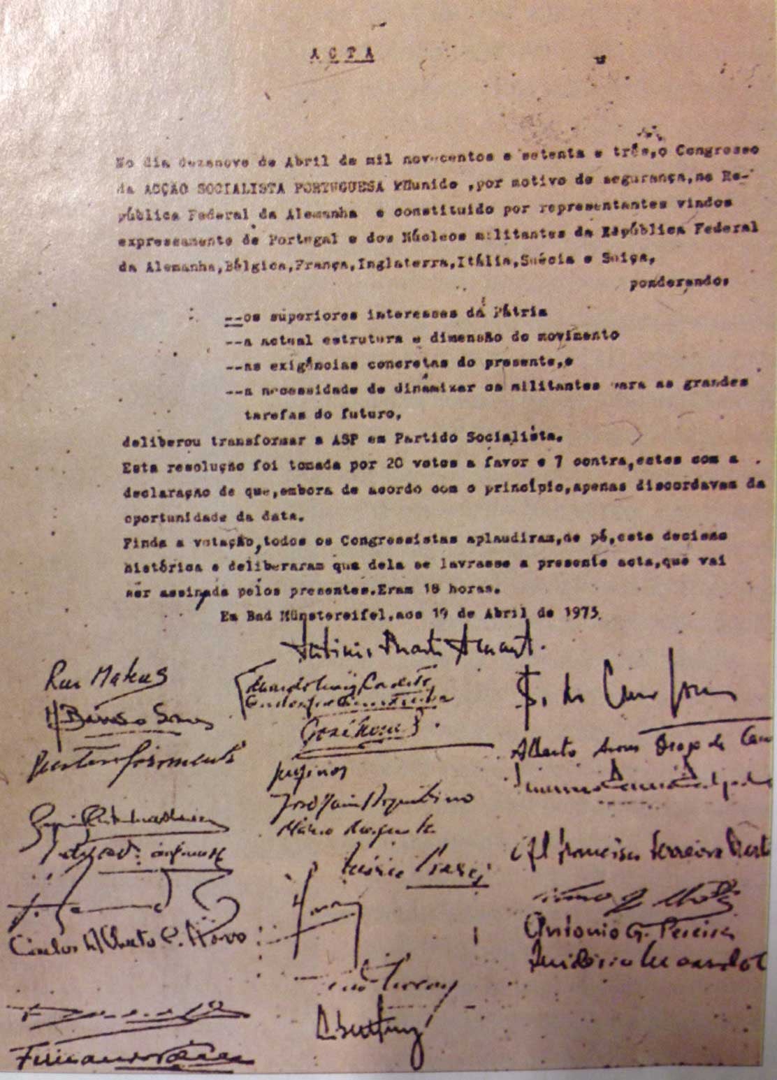 “No dia dezanove de abril de mil novecentos e setenta e três, o Congresso da Ação Socialista Portuguesa (ASP) reunido, por motivos de segurança, na República Federal da Alemanha (…) deliberou transformar a ASP em Partido Socialista”, pode ler-se na ata da fundação.