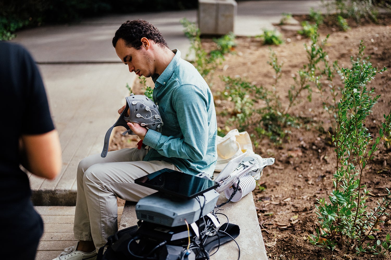 O estudante e investigador Rafael Ramusga prepara o eletroencefalograma | Foto: Pedro A. Pina - RTP