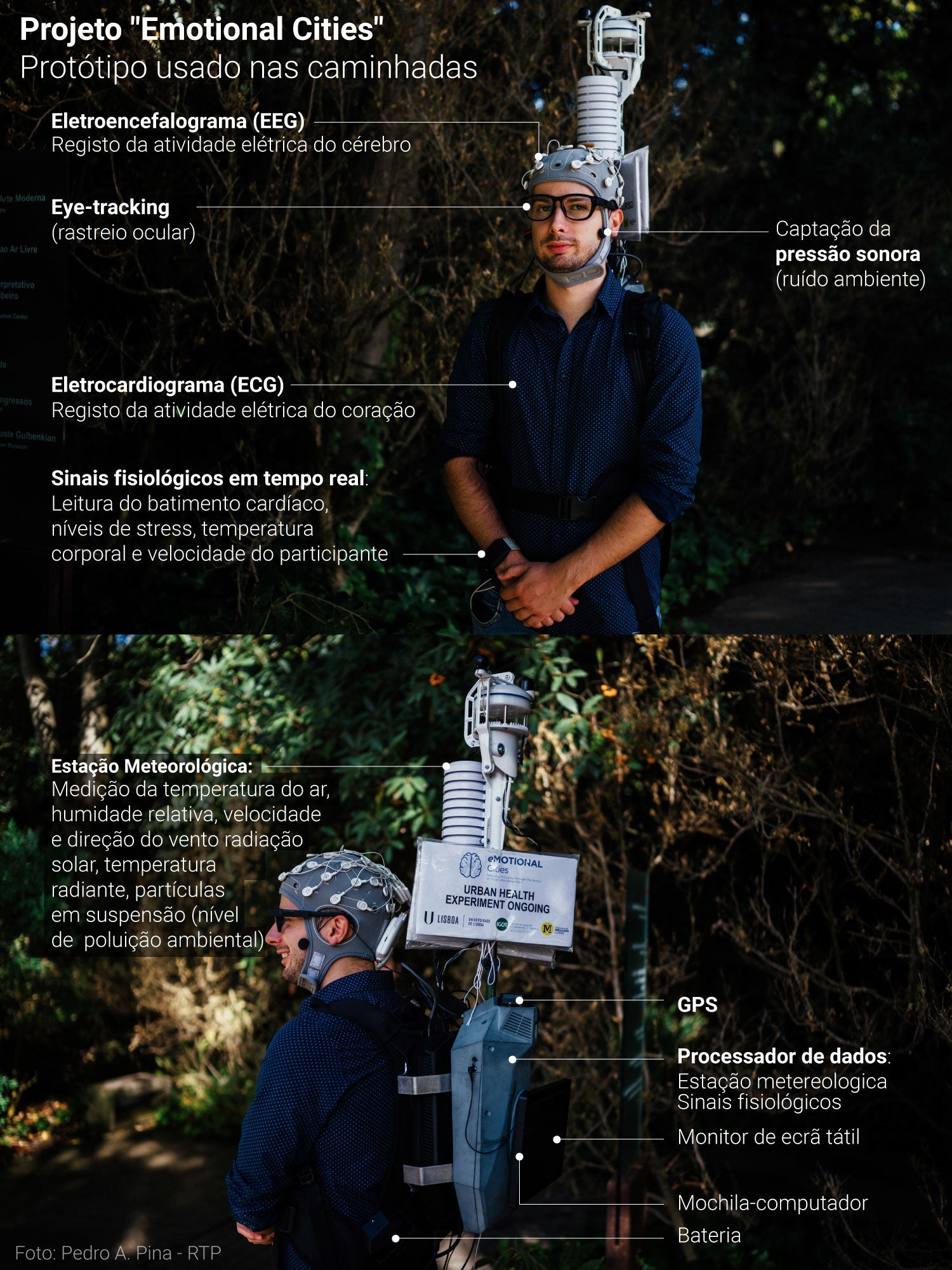 “Vai andar o mais naturalmente possível, esquecendo que tem uma touca de eletroencefalograma, que tem um eletrocardiograma e uma estação meteorológica nas costas”, diz Ana Bonifácio, do projeto "eMOTIONAL Cities".
