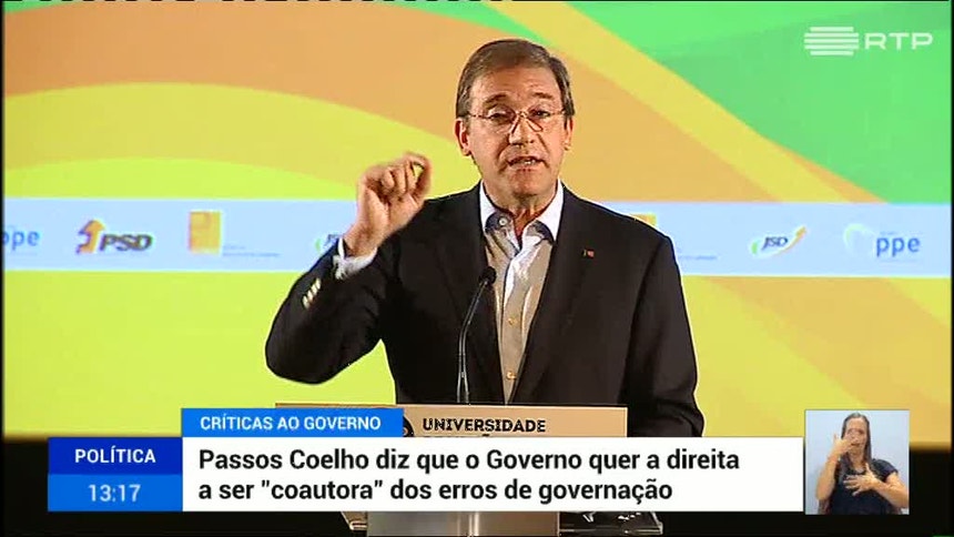 Pedro Passos Coelho acusa o Governo de querer aliciar a direita a ser coautora dos erros que estão a ser cometidos. No encerramento da Universidade de Verão do PSD, o presidente do partido afirmou também que o "espantalho da austeridade" já não convence ninguém.